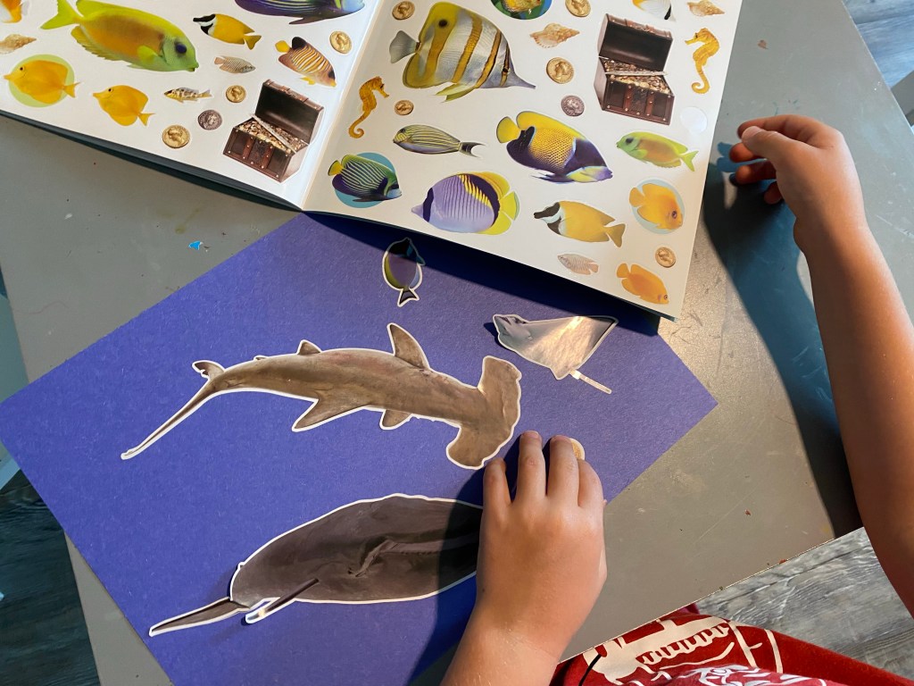 -Ocean habitat activity/are mermaids real?: I reviewed what an ecosystem is with my little and we brainstormed animals and plants that live in the ocean ecosystem. We discussed how the animals and plants in an ocean ecosystem are nonfiction…then I asked him if mermaids are fiction or nonfiction. He said they were real so we delved into a few videos of “real” mermaids to help us make that decision. 5 Real Mermaids Caught on Camera is a great one for kids- the mermaids are blurry and far away, much like the original Bigfoot video from back in the day. It should prompt some good discussion about what is in the video and if it’s a real mermaid or something else. Mermaid Melissa is also enchanting- she’s a human who has a legit looking silicone mermaid tail and does videos on YouTube of her swimming around various ocean scenes. As a finish up to our discussion I had my little make an ocean ecosystem using these ocean creature stickers I found on Amazon.
