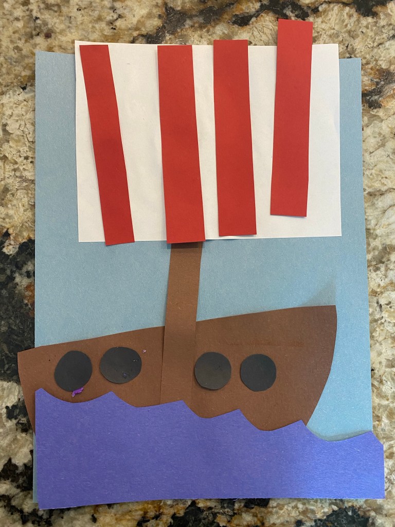 -Shape pirate ship: I gave my littles the shapes they’d need to make a pirate ship then gave them oral instructions on how to glue them together. I made sure to use shape and color words to help build their shape and color recognition skills.