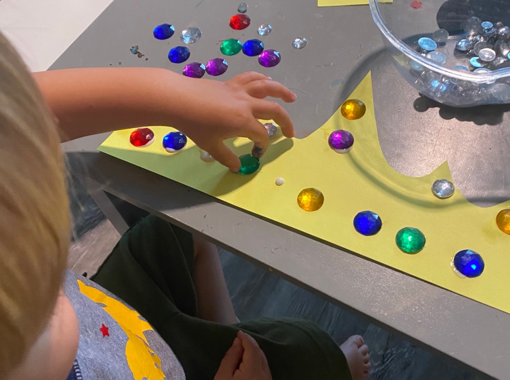 –Mermaid/sea king crown: I gave my little a cut out of a crown (my preschooler did his own cutting) and had him decorate it with plastic jewels (I placed wet glue on the crown and had him stick the jewels on- older children can do their own gluing). After the gems were dry, I taped a strip of paper to the back of the crown so that it fit his head and let him wear it to play.