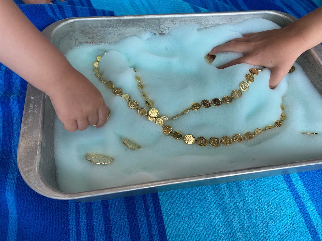 –Sunken treasure sensory play: I made foam by using my hand mixer to whip a splash of water with a good healthy squirt of dish soap (about 1/4 cup of each…I honestly didn’t measure! LoL) and some blue and green food coloring. If you have a whisk attachment, it’s a lot quicker, but if not the regular beaters work fine too! Then I put treasure like plastic jewels, bead necklaces, and plastic gold coins in the bottom of a cake pan and covered them with the foam. I let my littles hunt for the treasure in the pan- and we discovered the necklaces (and our hands) made fun bubble wands!