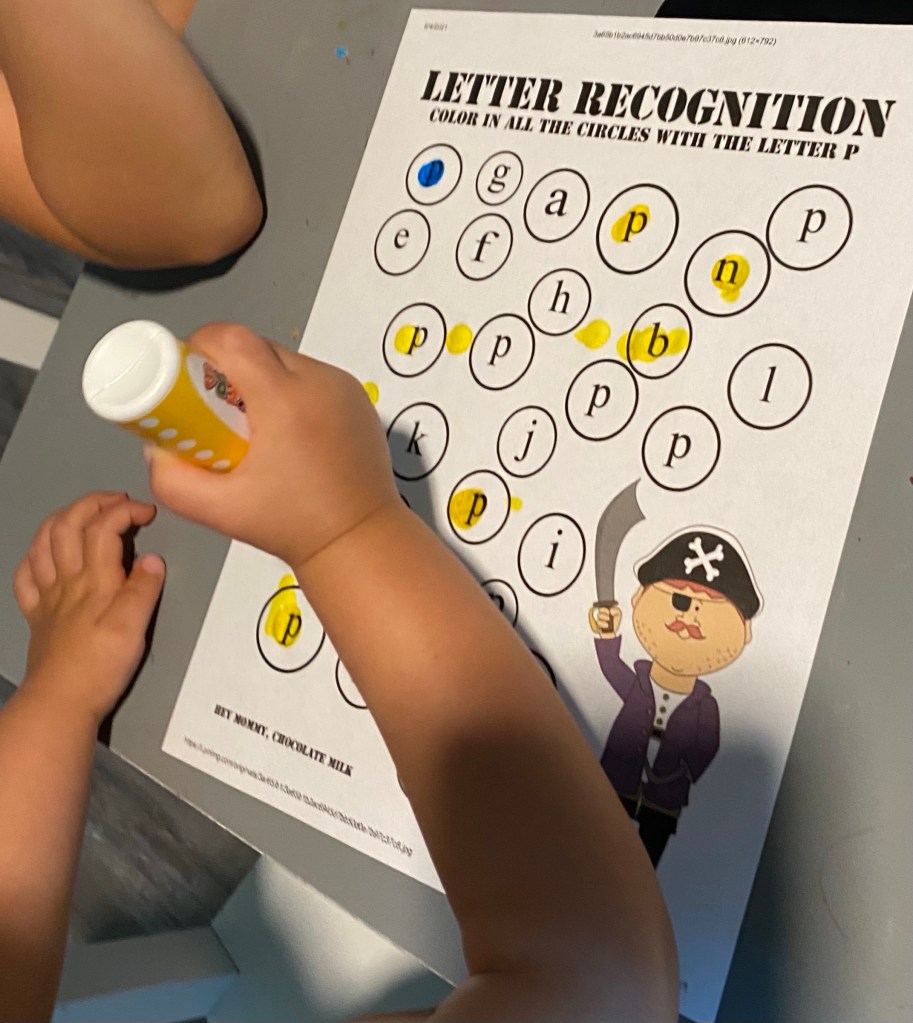 –P is for pirate letter hunt: I gave my little this “P is for Pirate” letter hunt page and showed him what the letter P looks like. Then I had him find the other P’s and mark them with a gold do-a-dot marker.
