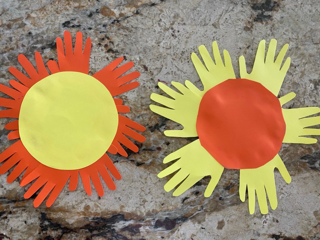 –Sun craft: Florida is known as “The Sunshine State” so we decided to make some suns! I cut out a circle then traced my little’s hand and cut it out (I folded the paper into 4th’s so I wouldn’t have to spend all day cutting out 8+ handprints! LoL) Then I had him glue the hand prints around the outer edge of the circle to make the sun’s rays! My preschooler did his own cutting but I only had him cut out one hand- I did the rest so he wouldn’t be there all day and get frustrated (he can’t quite cut a stack of 4 papers when it’s intricate like a hand yet!)