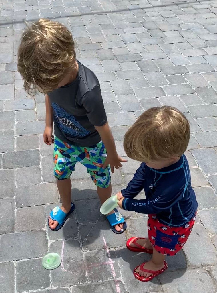 -Water balloon number hunt: I wrote the numbers 1-10 with sidewalk chalk on the driveway then called out numbers and had my littles find them. Then we’d say “1, 2, 3 SPLAT!” and they’d throw water balloons at them. You can get self filling/tying ones for about $8 at Walmart called “Bunch O’Balloons”….they’re AMAZING!