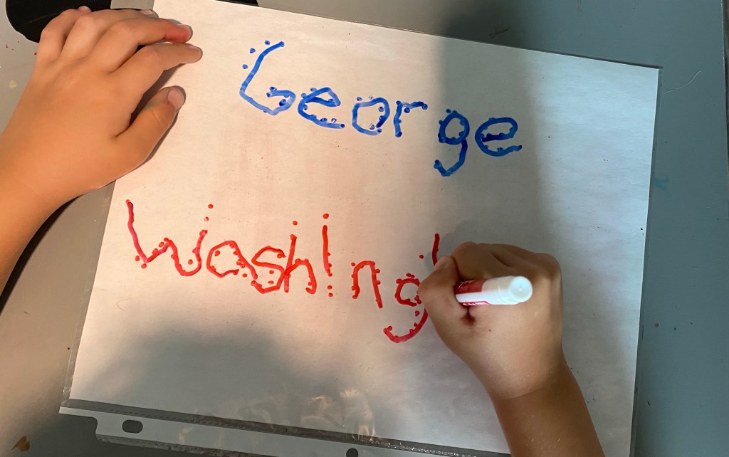 -Red, white and blue name practice: My little can write his own name really well, but just his first name so I wrote his full name (first, middle, last) with dots on a sheet of paper and tucked it in a page protector. I had him practice tracing and saying each letter with red then blue expo marker. I also had him write our first president’s name for the picture!