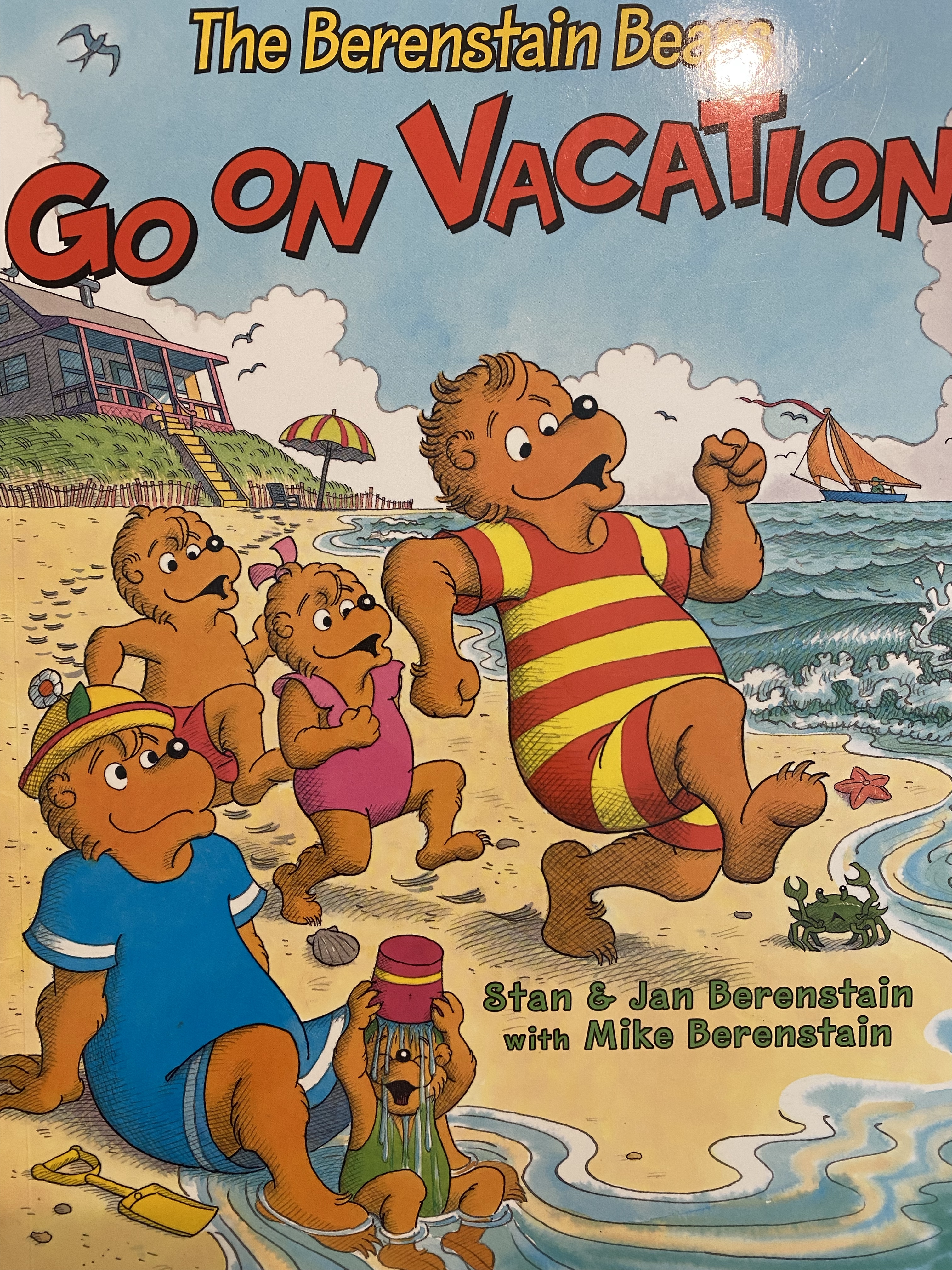 -Beach bears snack and story: I made a beach bear snack by mixing some blue food coloring in a vanilla pudding cup (blue Jello works even better cuteness-wise but Walmart was out!), adding a gummy life saver for a floatie with a gummy bear on top of it and a mini paper umbrella as a finishing touch. Then we read one of my favorite beachy books “The Berenstain Bears Go On Vacation”.