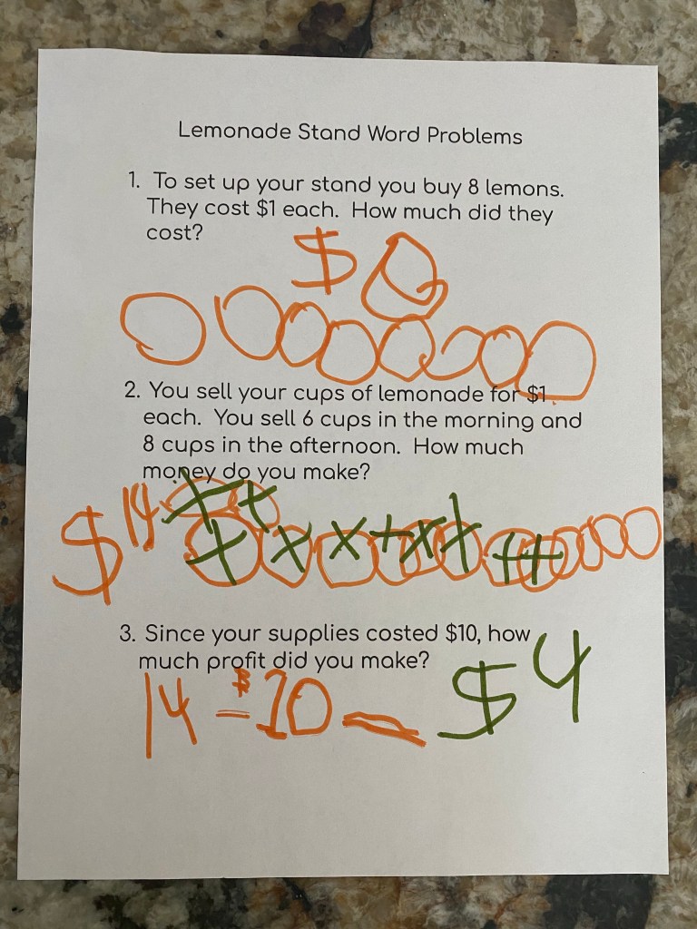 -Lemonade stand math problems: I wrote some lemonade stand math problems then printed them and had my little solve them using pictures.