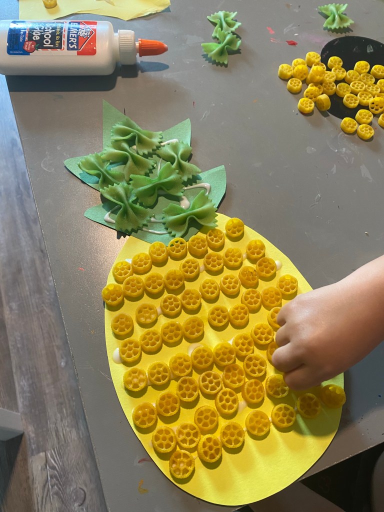 –Pineapple noodle craft: These came out soooo cute! First you dye some bowtie noodles green and some wheel noodles yellow (you could also use elbows, wheels are a bit hard to find but they are cuter!) To dye them just place 1/4 cup of vinegar with 10 drops of food coloring in a Tupperware and swish around to mix. Then place about 1 cup of noodles in and give it a good shake (your little can help with this!) Then spread them out on a sheet pan or old paper grocery bag to dry. To do the craft, cut out (or draw and have your little cut out if they’re older) the top and bottom pieces of a pineapple and glue them together. Have your little use wet glue to stick the bowties to the top of the pineapple and the wheels to the bottom! This makes for great fine motor practice too! I got this from ABCDeeLearning on Pinterest.