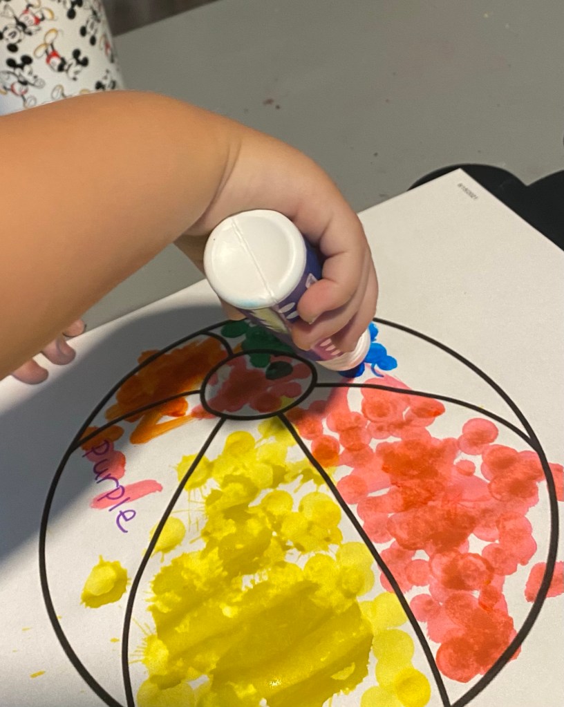 –Beach ball color match: I printed a beach ball picture then wrote color words in each section with the matching marker. Then I had my littles dot each section to match the color word.