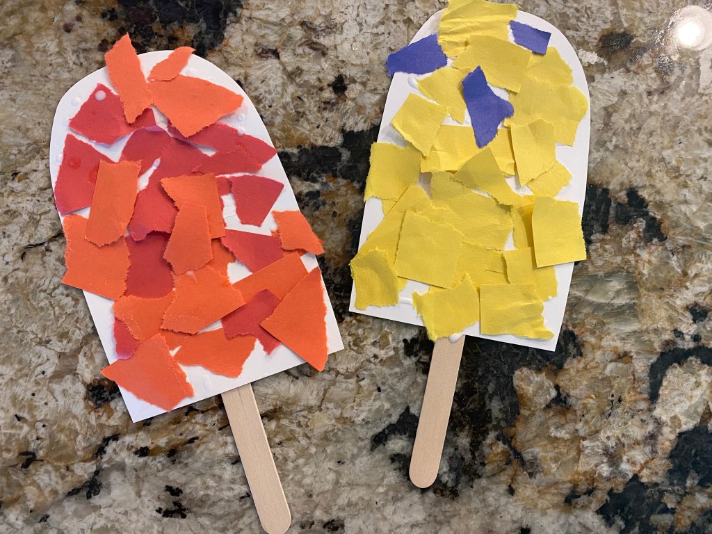 –Popsicle paper tear craft: I cut out a popsicle shape then had my littles choose a few colors of construction paper. Then I had them tear the paper into little pieces (this was a bit tricky for my toddler so I helped him) and they glued them down to make colorful popsicle mosaics! I glued a stick to the bottom when they were finished. I got this from A Dab of Glue Will Do.