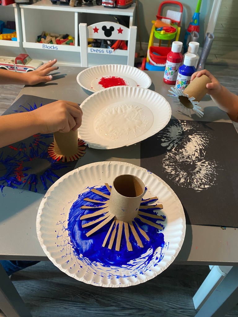 –Firework painting: This is such a fun activity and if you just let your littles go to town, it comes out so pretty! First you cut strips at the bottom of 3 toilet paper tubes- I did short on one, medium on one and long on the last one. Flatten out the strips so they look like a star burst/sun rays. Then dip each one in a plate of red, white or blue paint (you should have one tube per color). Have your littles use the tubes as stamps to paint a grand finale for the 4th of July!