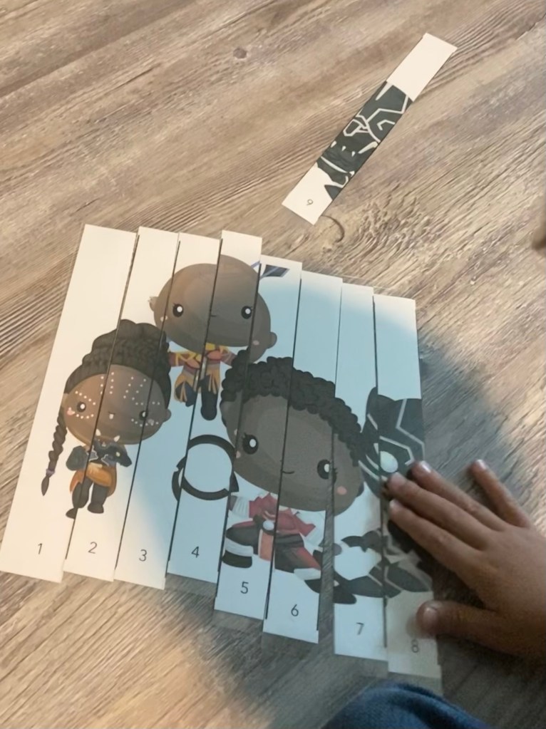 -Black Panther number puzzle: I printed this Black Panther number puzzle from Teachers Pay Teachers, laminated it and cut it out then had my little put it together using his number knowledge.