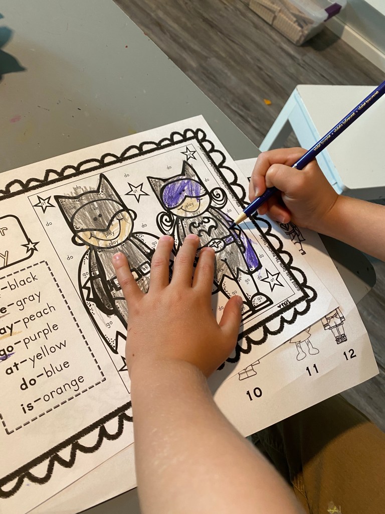 -Color by sight word: I printed this super hero color by sight word on Teachers Pay Teachers then had my little color it according to the key.
