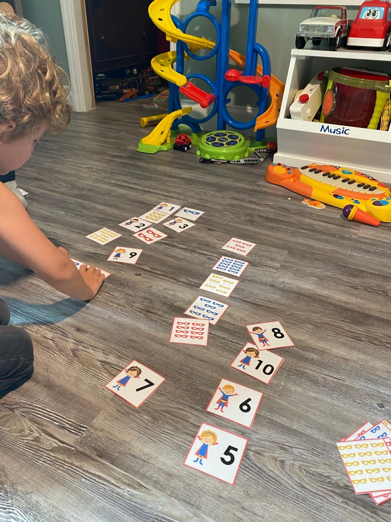 -Super hero number match: I printed these super hero number match cards from Teachers Pay Teachers, laminated them, cut them out then had my little match the masks up to the correct number. These are great because they include 1-20. If that’s too many for your little to do at once, you can split them into 1-10 and have your little match those then have them do 11-20.