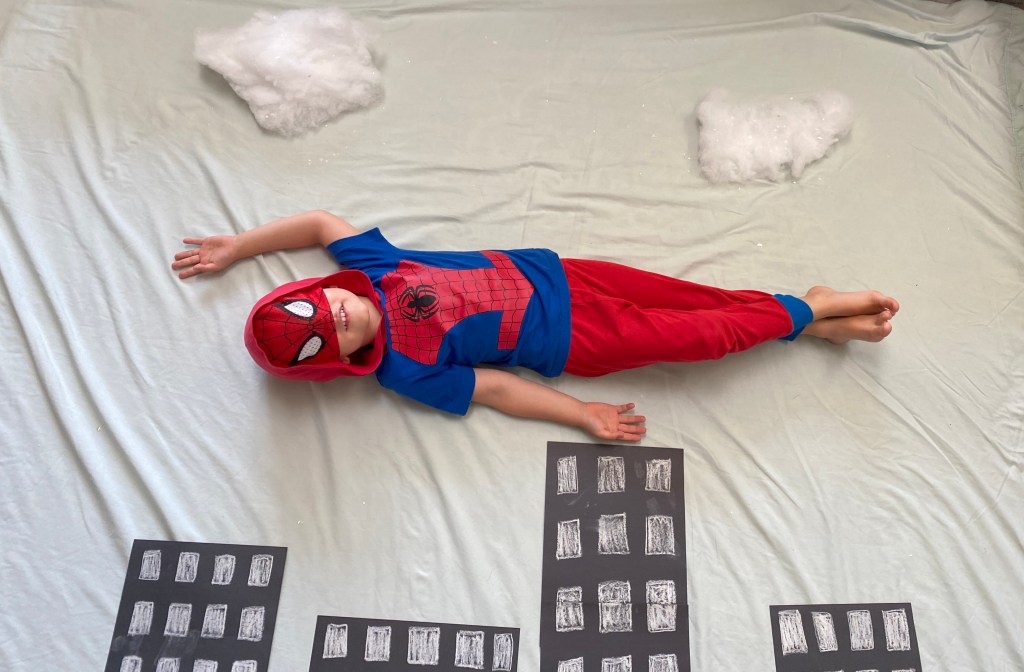 –Super hero flying picture: These take a minute to set up, but they come out SO CUTE! I actually did them with my boys last year during Covid lockdown, but they’re so much fun I knew I had to share them here too! You just make a city scene with a blue blanket or sheet, some buildings made of construction paper, and clouds made of pillow stuffing (you can get bags of it at Walmart for like $2). Then you have your little dress in their favorite super hero costume and lay in the scene above the buildings like they’re flying while you stand on a chair and snap a few pictures! I got the idea from Teacher’s Pet on Pinterest.