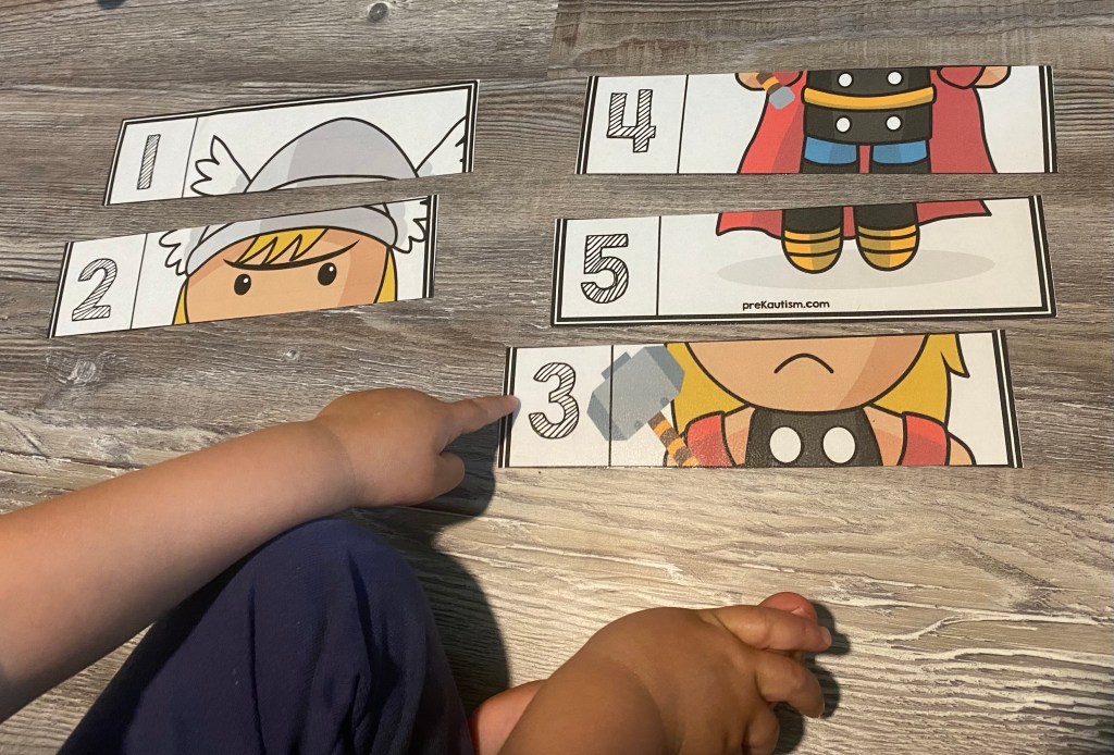 –Thor number puzzle: My little enjoyed doing this simple puzzle so much he did it 3 times! It’s a fun way to work on basic number skills! I just printed the Thor puzzle out and laminated it then cut out the strips. I had my little find 1, then 2 and so on and put them in order to make the picture.