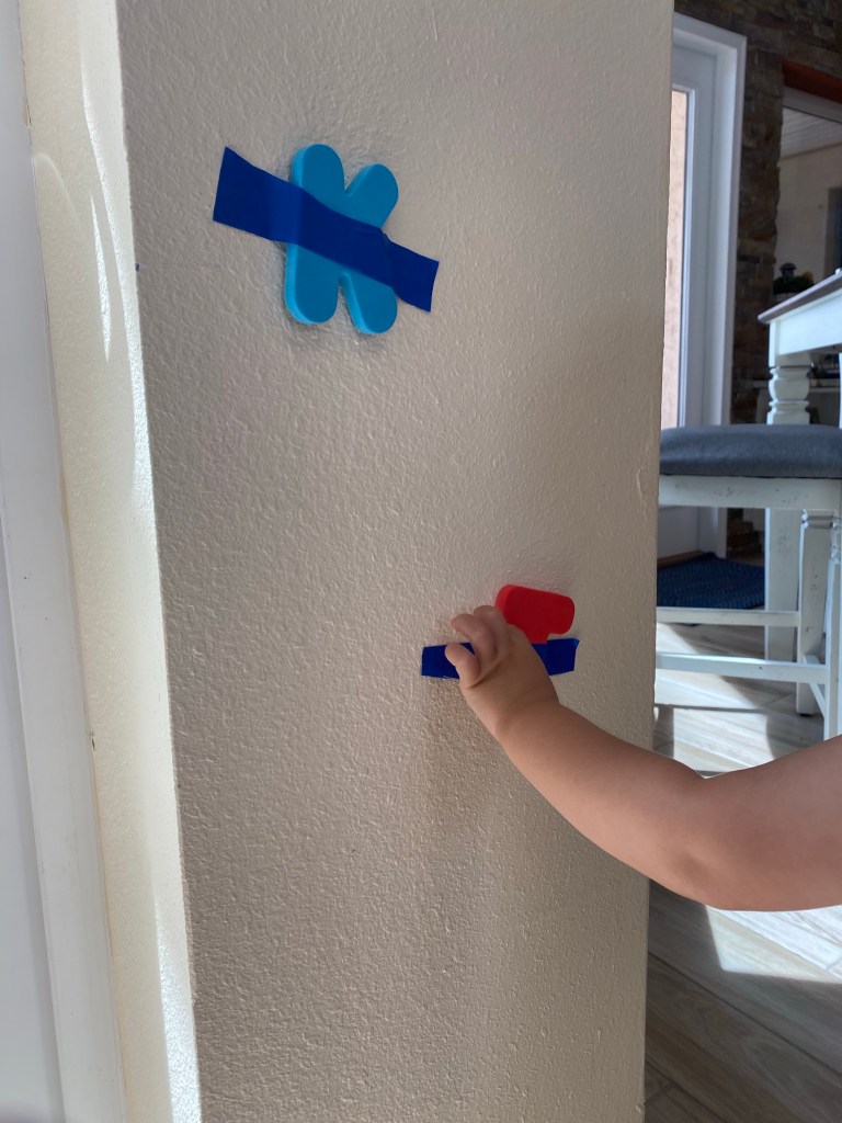 –Letter rescue mission: Tape all the letters in a set of foam ABCs to the wall and then have your little “rescue” them by un-taping them and bringing them to you. Have them identify the letter if they can, and if not identify it for them and have them repeat you while looking at it. I got this idea from Entertain Your Toddler.