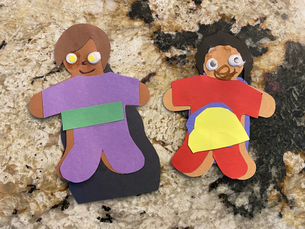 –Design a hero: I let my littles each pick a paper person cut out then decorate it as a super hero. To make the suits, I had them pick a color for the suit and cape (I traced the paper people minus the head and hands and cut out my tracing to make the suits- the boys did their own gluing). I also had several hair choices cut out from last year’s 4th of July diversity banner making activity, so I just let them pick one of those.