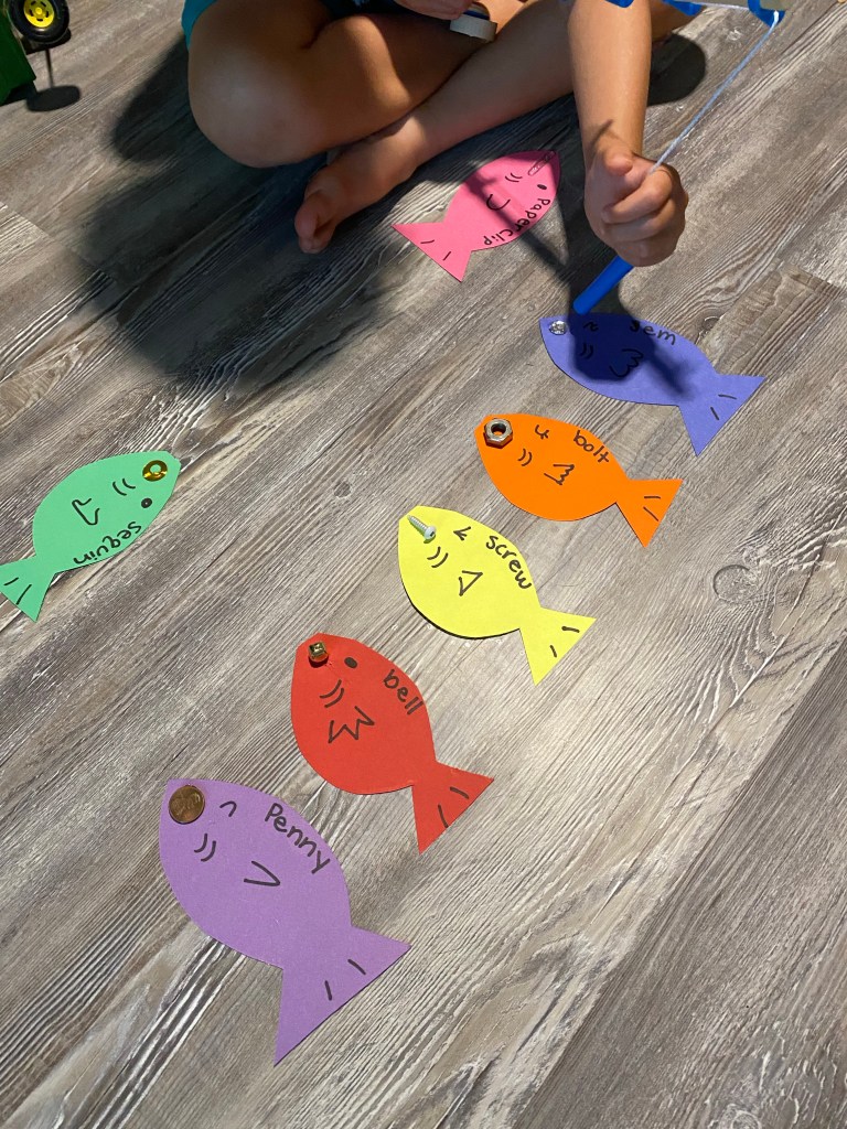 -Magnetic or not fishing exploration: I made a version of this this magnet exploration activity for my 2nd graders back when I started teaching, so I thought I’d do it with my littles too! You just cut out some fish from construction paper or craft foam, hot glue some metal/metallic items in their “mouths” and have them fish for the items (you can make a fishing pole with a string, a magnet and a pencil- or just use your Melissa and Doug pole from the math game above like we did!) As your little tries to catch the fish, have them sort them into “magnetic” and “not magnetic” piles. Then discuss why they think each fish was magnetic or not. The purpose of this activity is to determine that some metals are magnetic and some aren’t (kids usually think all metals are), and that some items look metallic but are actually plastic- which is non-magnetic.