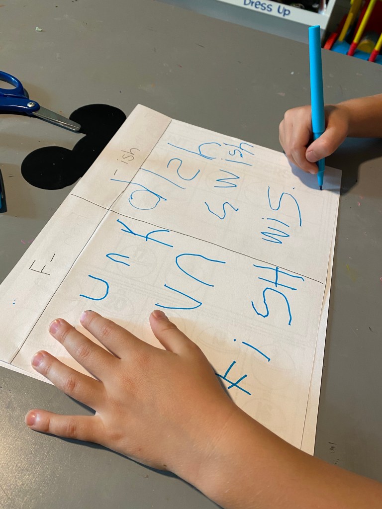-F- and -ish families: I had my little brainstorm and write words that start with the “f” sound and end in “-ish”. I helped him sound the words out after he thought of them.