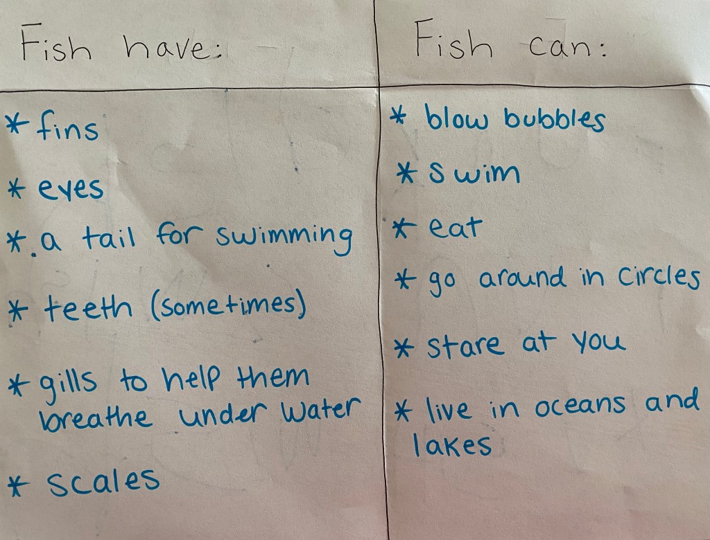 -Fish have/can: As a wrap up to the week I had my little brainstorm what fish have and what fish can do. I wrote down his thinking on a T-chart.