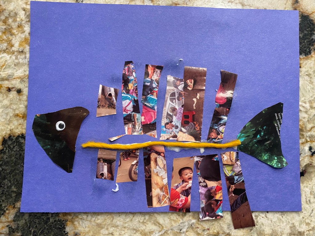 -Fish bone collage art: First, have your little find a colorful page in a magazine you don’t mind chopping up. Then have them cut out thin rectangles from the page. Give them a piece of yarn and have them glue it to a sheet of construction paper then glue the rectangles on either side for the fish’s bones. Have them cut out 2 triangles and add them for a head and tail, and pop a googly eye on as a final touch! I got this idea from Fine Lines.