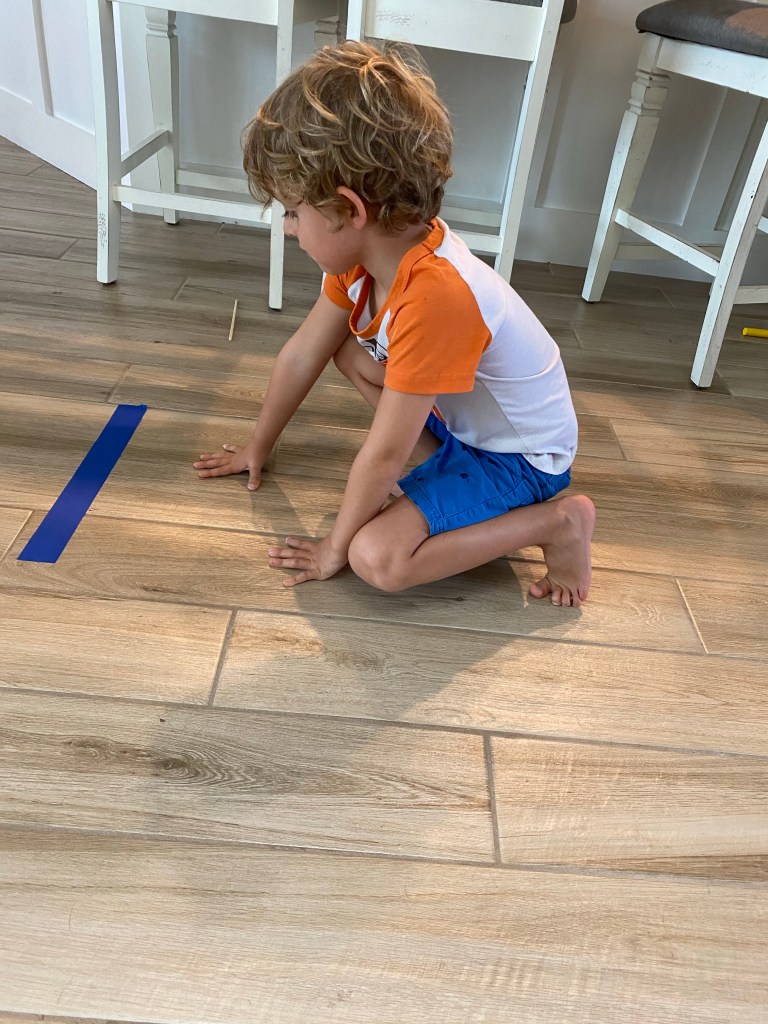 -Pole vaulting: This was my favorite because it was so darn funny- plus my little thought it was really fun! Put a piece of tape on the floor for a starting line then give your little a Swiffer (or a broom) and show them how to use it to “pole vault” by placing the Swiffer on the line and using it to help them jump…now granted they’re not going to be jumping over a high bar, but they can use it to leap some distance (my little was landing at around 45 inches!) Then use a tape measure to measure how far they jumped from the starting line to their back foot- have them identify the numbers in their measurement, then put them together (ie. 4 tens and 5 ones makes 45).