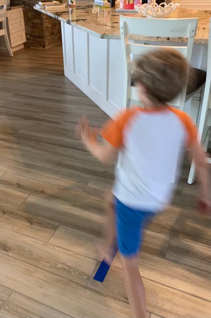 -Sprint: Set up a starting line in your house or outside and use a stopwatch (most phones have one) to time your little running one lap (or from the starting line to a finish line). When they’re done, have them identify the numbers in their time then run again to try to beat it, or have their sibling run it and try to beat their time (or have them time you running- that’s what we did! LoL)