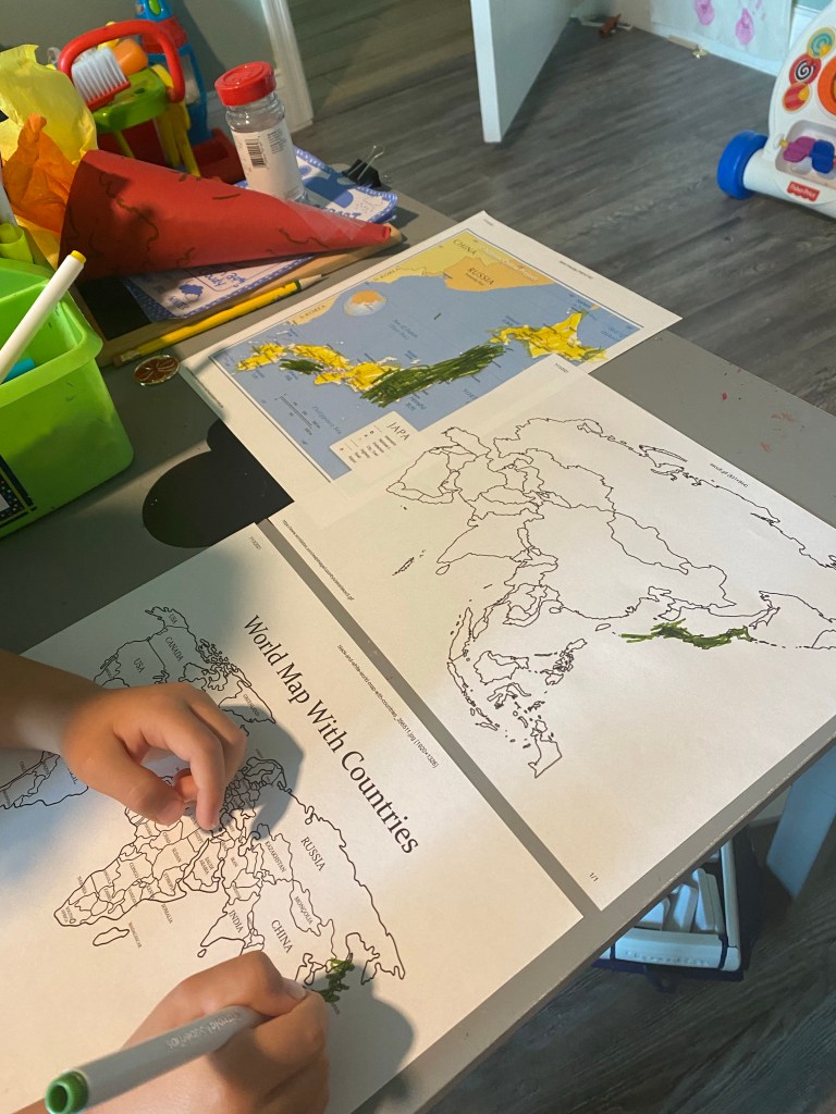 -Japan on the map: Since they Olympics are being held in Tokyo, Japan this year I printed maps of the world, Asia and Japan and had my little color Japan on each one. We started with the map of Japan where we also found and circled Tokyo, then worked our way out to the world. On the world map, we also found the United States and our state to see how far away it was to Japan.