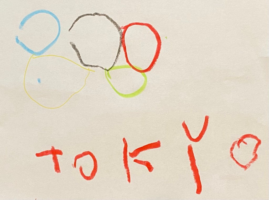 -Draw an Olympic flag/poster: I had my little look at and draw the Olympic rings logo, then write Tokyo under them to make a flag to hang on his wall during the games.