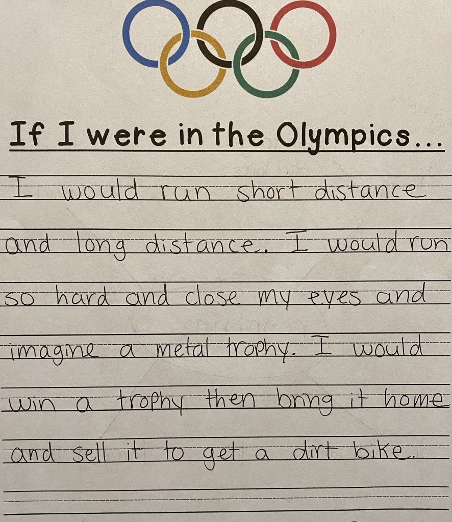 -Olympic word spelling: I helped my little sound out gold, silver, bronze, metal and win by saying each sound and letting him identify and write the letter to make the word.