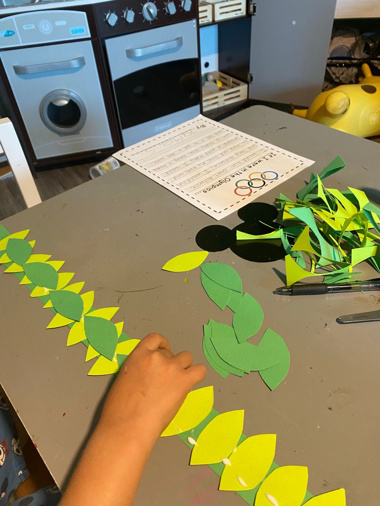 -Olive leaf crown: I cut out some olive leaves from light and dark green construction paper, then had my little glue them to a strip of green paper to make a traditional olive leaf crown like they gave out at the first Olympic games in Greece!