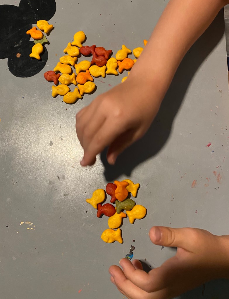 -Rainbow Goldfish cracker counting: I gave my little a few handfuls of Rainbow Goldfish crackers and had him count them to work on accurately counting large groups. Then he ate them for a snack.