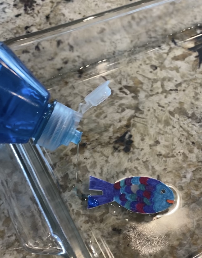 -Swimming fish surface tension experiment: This was SO COOL- if you follow me @littlelovesandlearning on Facebook I posted a video of it this week. So you cut out some 2 inch fish from white craft foam then have your littles decorate them with Sharpies. Cut a rectangular notch in the fish’s tail. Place the fish in a cake pan with about 1/2 inch of water in it. Add a drop of dish soap to the notch in it’s tail and watch it zoom across the pan! Hint: If you want your little to do their own dish soap, it works better if you put it in a pipette first. If you want to do it more than once, you have to wipe all the soap out of the pan and change the water. The reason this works is because on the surface of the water the molecules are held tightly together creating something called “surface tension”- I explained this to my little as the molecules holding hands really tight (as I also held his hand). Then when the soap touches the water, its molecules break the tight bonds- and the surface tension- and the broken bonds create space for the fish to zoom through.