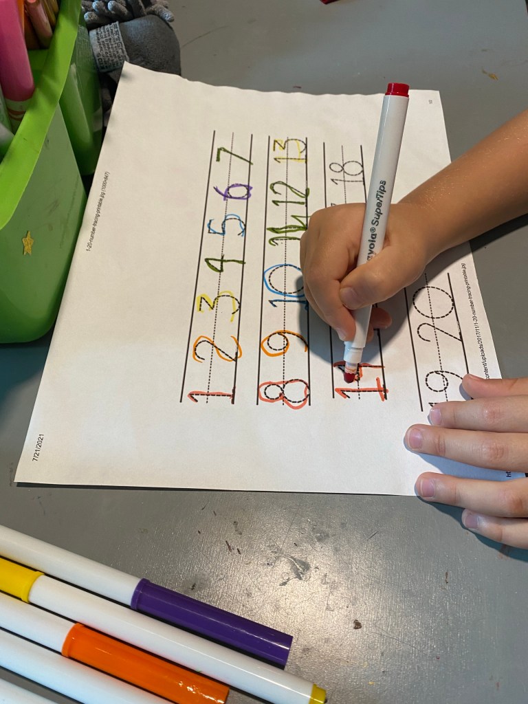 -Rainbow write 1-20: I gave my little a 1-20 tracing page and had him write his numbers in rainbow colors.