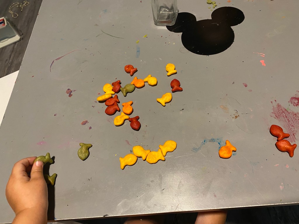 –Rainbow Goldfish color sort: I gave my little a handful of Rainbow Goldfish crackers and had him sort them by color then count how many were in each group. Then he ate them for a snack.
