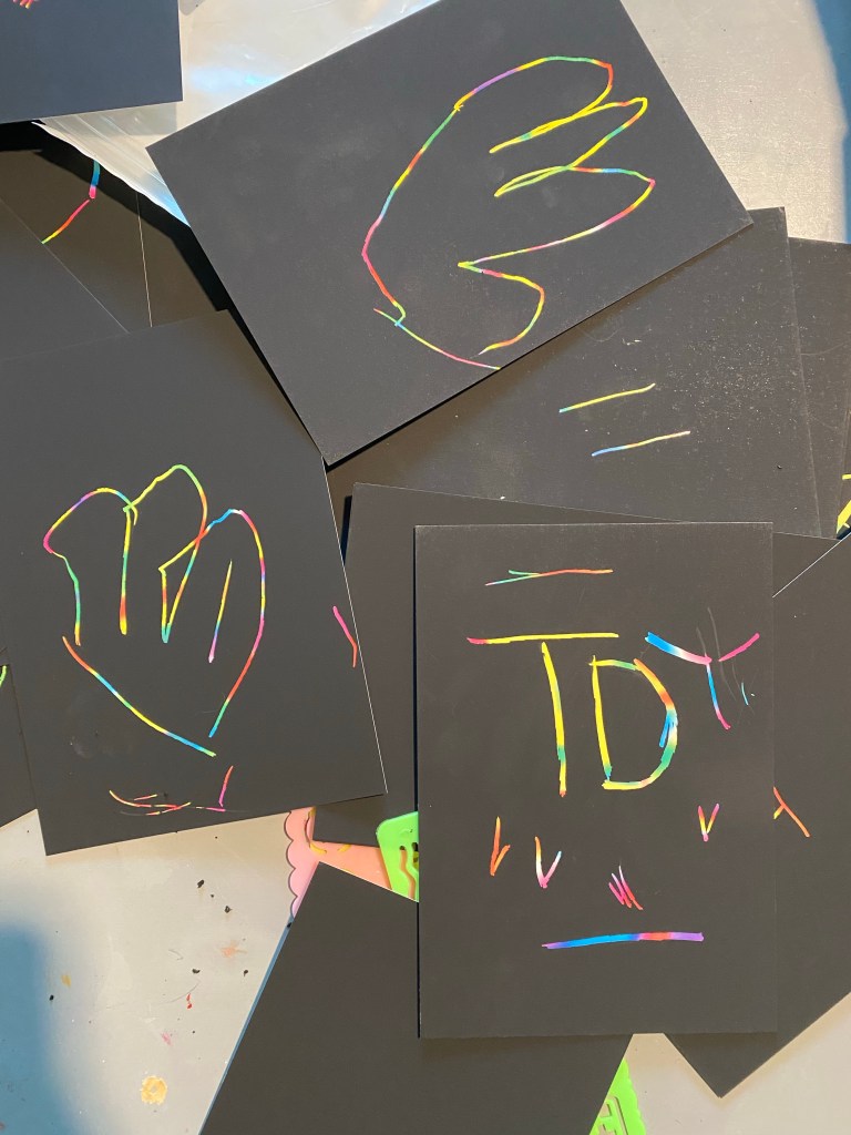 –Rainbow scratch paper: My littles LOVED exploring art with these rainbow scratch papers I got on Amazon. The set came with 50 sheets of scratch paper as well as scratching tools and stencils. I just let my littles explore with the set to their hearts’ content!