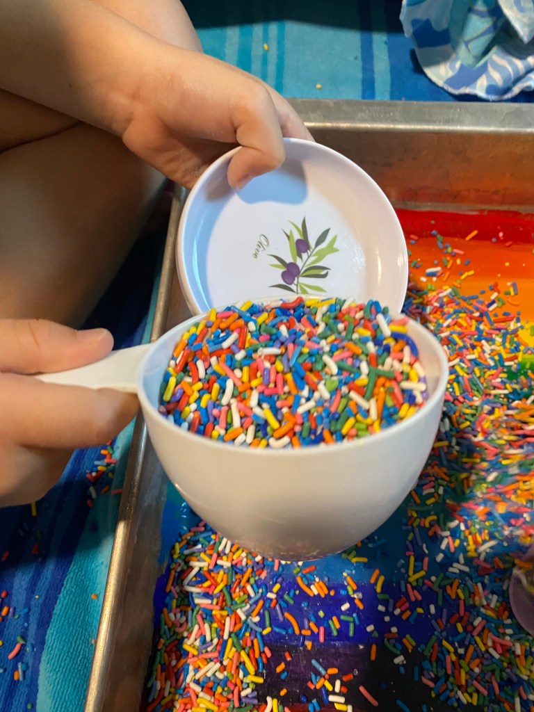 –Rainbow sprinkles sensory play: I gave my littles a cake pan with rainbow sprinkles in it and a few scooping utensils then let them explore and play.