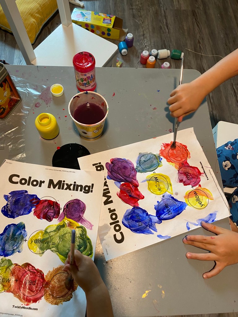 –Color mixing: This is a great activity to do first if you’re doing the tie dye activity below because it may help your little understand color theory before they dive in and end up making a brown shirt by mixing colors opposite on the color wheel (ie. orange and blue, purple and yellow, red and green all make brown). You just place a dot of paint in each circle, then have your little use the two colors of paint to make a new color.