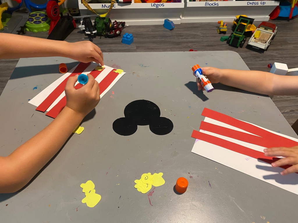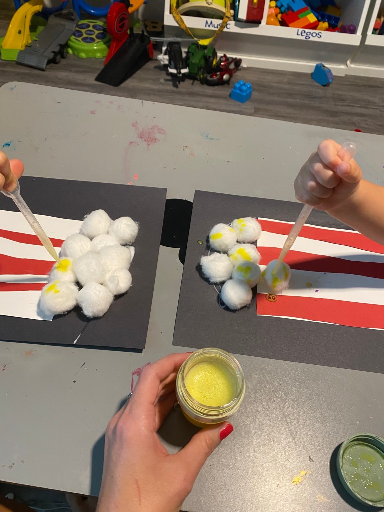 –Popcorn bucket craft: My littles loved this craft from Steamsational! I gave them full sheets of black paper, and half sheets of white paper and had them glue the white to the black. Then I gave them some red construction paper and had them cut strips out to make stripes on the white half sheet (I helped my toddler with the cutting by holding his paper for him while he used the scissors like gardening sheers…LoL You can always do all the cutting if your little is younger). Then came the fun! I had my littles glue cotton balls to the top of their buckets and use pipettes to drizzle “butter” on them (aka washable paint mixed with water). They had a blast with that part!