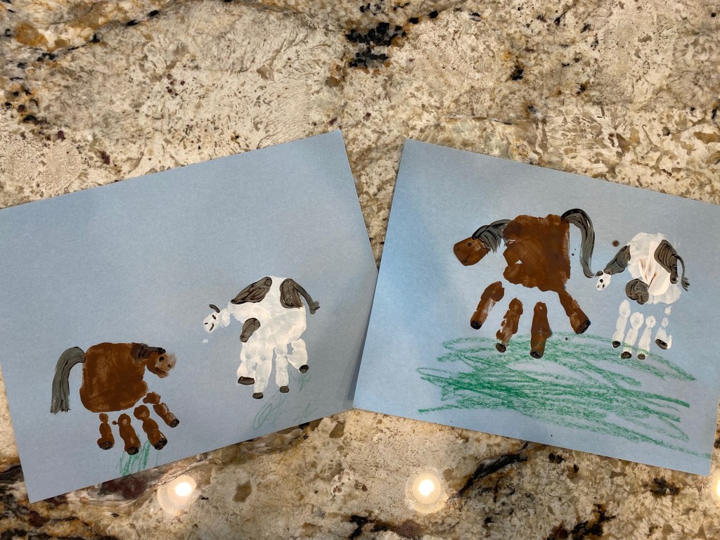 -Cow and horse handprint art: I used my littles’ hands to make a brown print for a horse and a white print for a cow. After they were dry we added details like spots and grass.