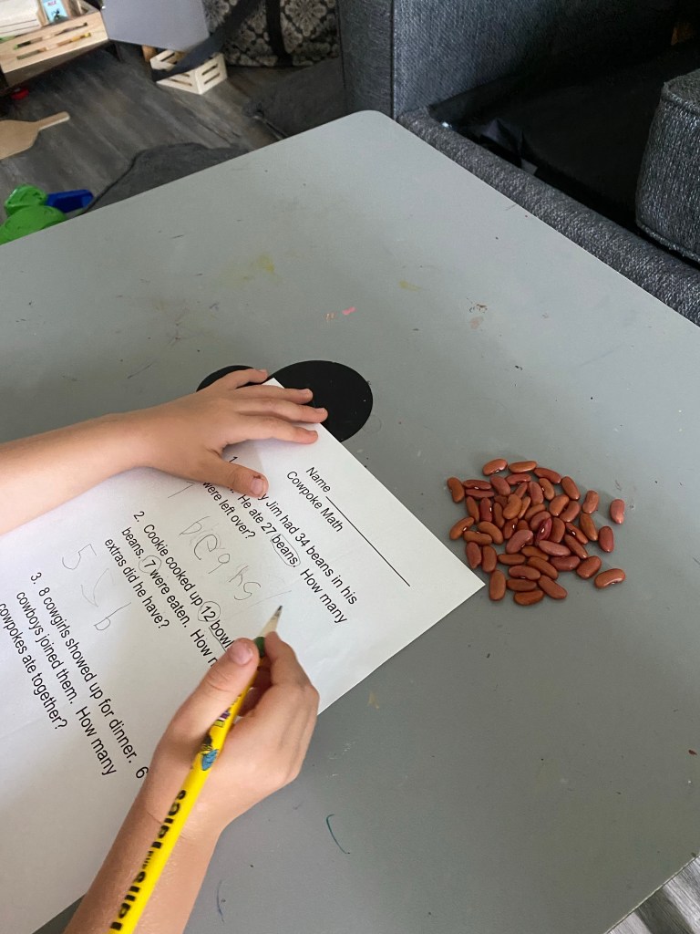 -Cowpoke math: I made up these three cowboy themed math problems and then had my little use cowboy food… aka beans…to help him solve the problems. The first problem uses larger numbers because my little needs to practice accurately counting large groups- if the numbers are too much for your little that’s totally OK! I think you can edit the document before you print it…or just white out the ones place!