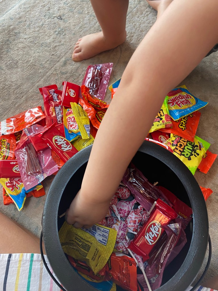 -Estimate and count candy bowl: I showed my littles what 5 pieces of candy looks like, then asked them how many handfuls they thought could fit in our candy bowl (a bit easier to estimate than asking them to give a larger double digit number). Then we counted all the candy in the bowl to see if our estimating was correct.