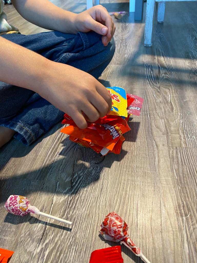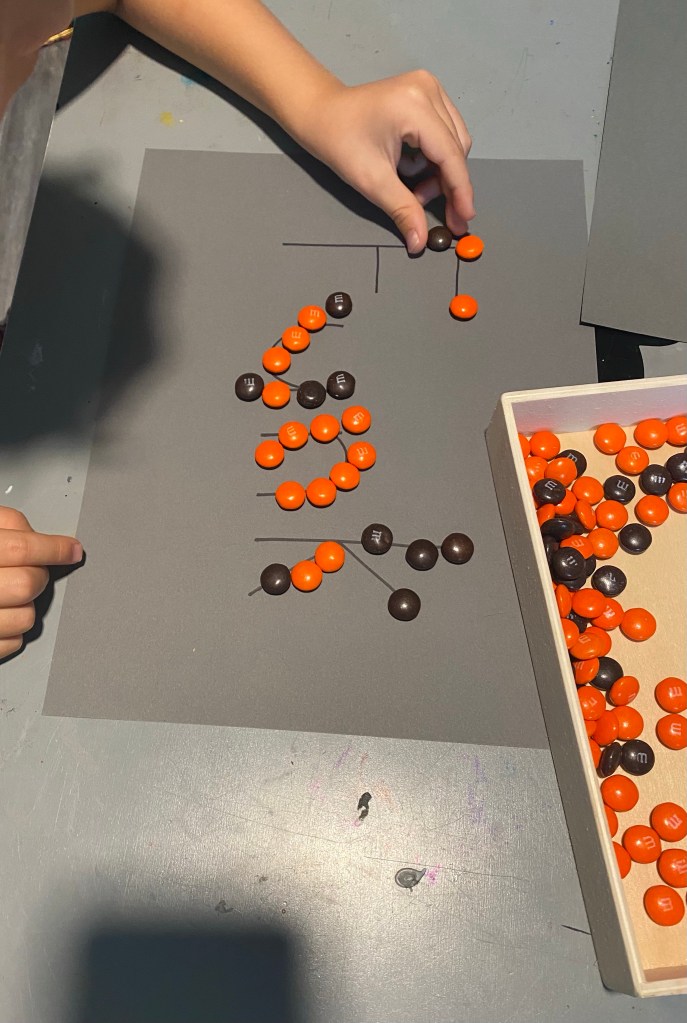 -Sort and count Halloween candy: I had my littles sort Halloween candy into lollipops, chocolate, gummies, and pieces (like M&Ms, Reese’s Pieces). Then we counted each group.