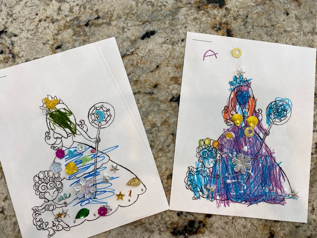 -Queen Frostine decorating art: I printed pictures of Queen Frostine from the Candyland game, then had my littles color her and decorate her with sequins.