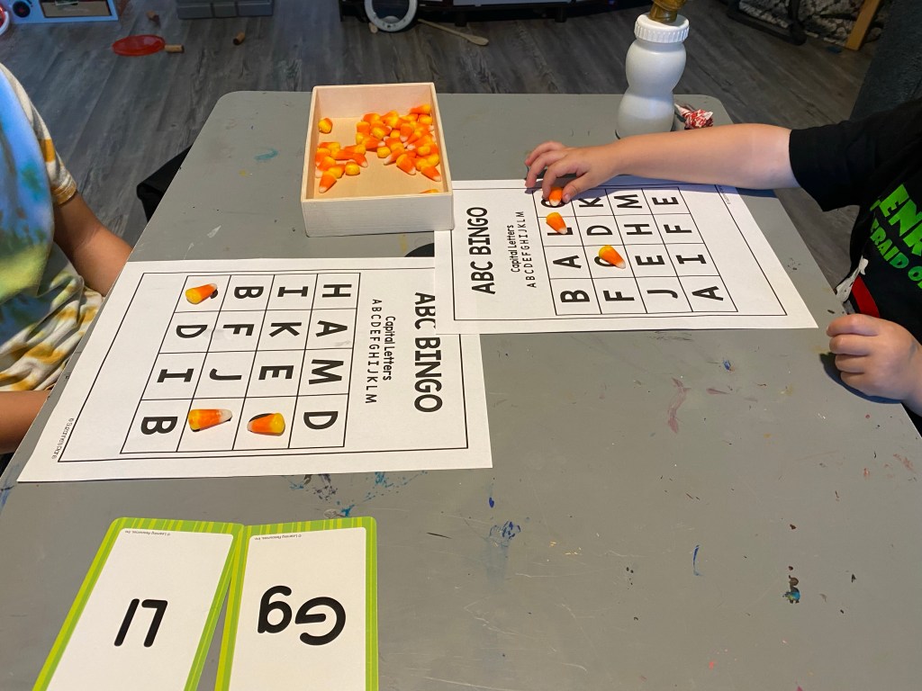-Candy ABC bingo: I printed some ABC bingo cards from Teachers Pay Teachers, then called out letters and had my littles find them and mark them using candy corns.