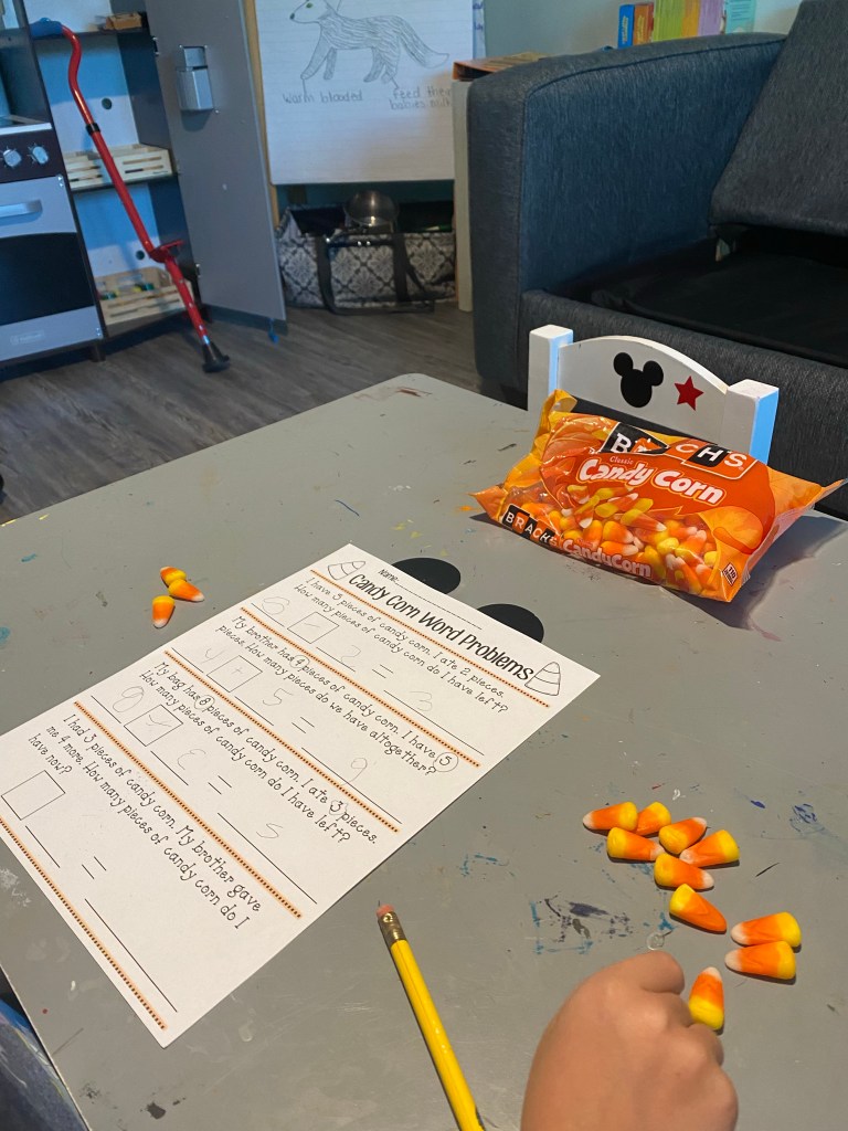 -Candy corn word problems: I printed this set of candy corn word problems from Teachers Pay Teachers then had my little use candy corns to act out each problem and write the coordinating equation.