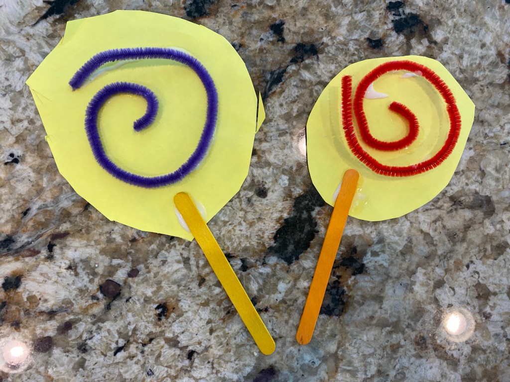 -Lollipop craft: I had my 5 year old trace a bowl on a sheet of construction paper then cut it out (I did the tracing for my 2 year old and held the paper while he cut). Then I helped them make a spiral from a pipe cleaner to glue to their circles. Finally they added popsicle sticks to their lollies as a finishing touch.
