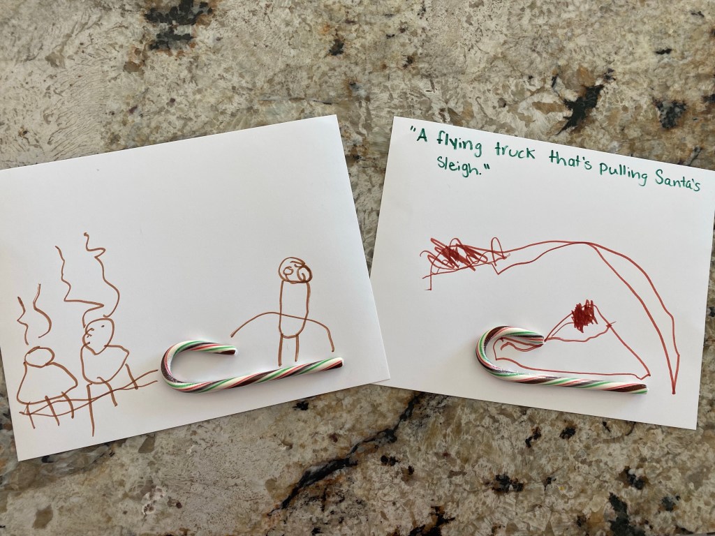 -Candy cane Santa sleigh: I glued a candy cane to a piece of paper and told my littles it was the runner to Santa’s sleigh (the part that slides on the snow). Then I had them draw the sleigh, Santa and reindeer to complete the picture (or in my 3 year old’s case, a flying truck to pull the sleigh…hahaha)