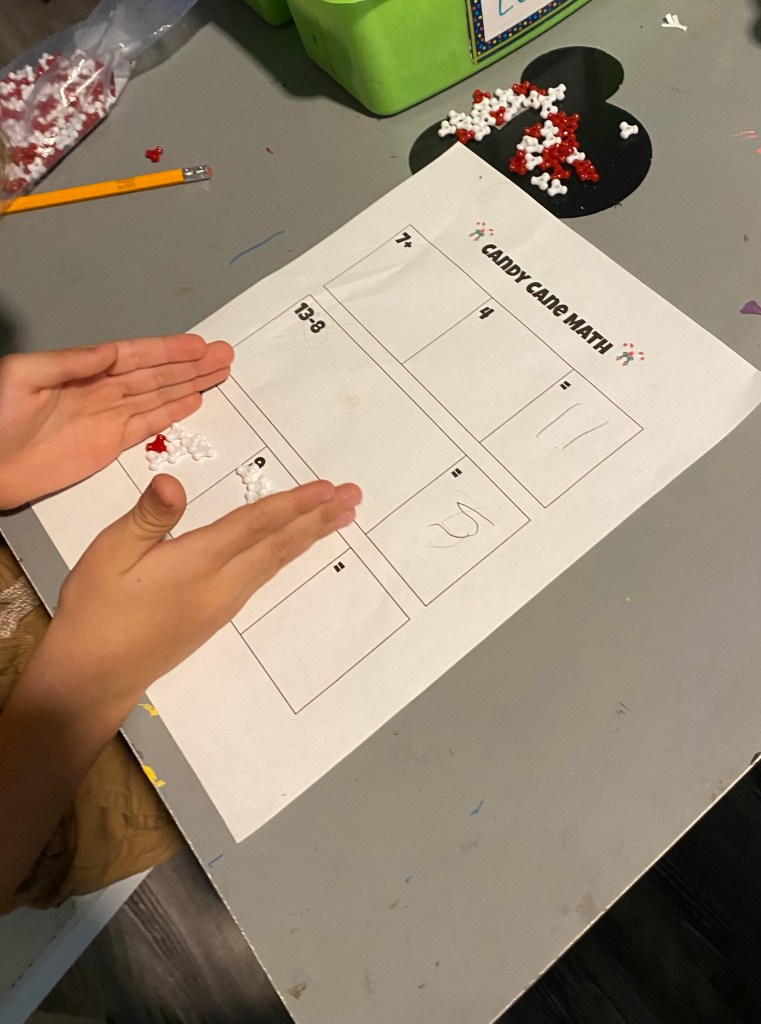 –Candy cane math: I intended to do this with peppermint circles but my boxes were too small for them so we ended up just using red and white beads. You can edit the numbers on the document to suit your little’s math ability! Basically for addition they build each number in each box, then count up the total and write it in the last box. For subtraction they build the first number then take away the second (all in the same box).
