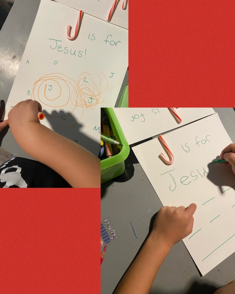 -J is for Jesus candy cane letter practice: I placed an upside down candy cane on each of my little’s papers and asked what letter it was (J!) I said “We celebrate Christmas because it’s Jesus’s birthday- and candy canes make a letter J- for Jesus!” Then I had my 3 year old search for and circle the letter J’s I’d hidden on his page. My 5 year old practiced writing J’s and Jesus neatly (I just hand made the worksheets- it took 3 minutes tops!)